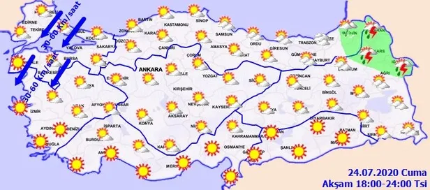 Az bulutlu ve açık geçeceği tahmin ediliyor. Rüzgarın; bu akşam (24.07.2020) saatlerinde Kuzey Ege'de kuzey ve kuzeydoğu yönlerden yer yer kuvvetli (30-60 km/sa) olarak esmesi bekleniyor.