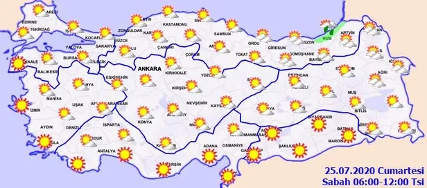 Meteoroloji Genel Müdürlüğü tarafından yapılan son değerlendirmelere göre; Ülkemizin kuzeydoğu kesimlerinin parçalı ve yer yer çok bulutlu, Doğu Anadolu’nun kuzeydoğusu, Trabzon, Rize ve Artvin çevreleri ile Giresun'un iç kesimlerinin yerel olmak üzere sağanak ve gök gürültülü sağanak yağışlı, diğer yerlerin az bulutlu ve açık geçeceği tahmin ediliyor. Peki İstanbul, Ankara ve İzmir'de hava nasıl olacak? İşte, 25 Temmuz il il hava durumu tahminleri...