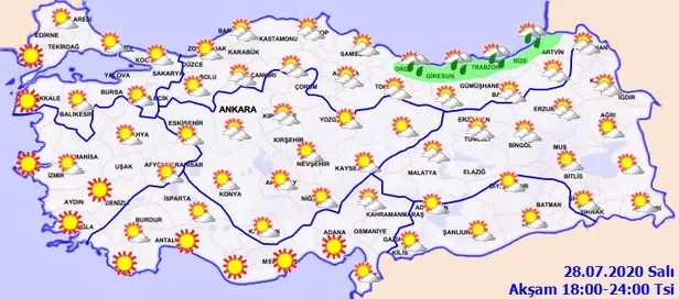Meteoroloji Genel Müdürlüğü tarafından yapılan son değerlendirmelere göre: Ülkemizin kuzey ve doğu kesimlerinin parçalı ve yer yer çok bulutlu, Batı Karadeniz'in doğusu, Orta Karadeniz kıyıları, Doğu Karadeniz, Doğu Anadolu’nun doğusu, Çankırı, Çorum, Elazığ, Tunceli ve Bingöl çevreleri ile Malatya'nın kuzey ilçelerinin yerel olmak üzere sağanak ve gök gürültülü sağanak yağışlı, diğer yerlerin az bulutlu ve açık geçeceği tahmin ediliyor. Peki İstanbul, Ankara ve İzmir'de hava nasıl olacak? İşte, 28 Temmuz il il hava durumu tahminleri...