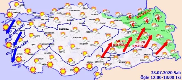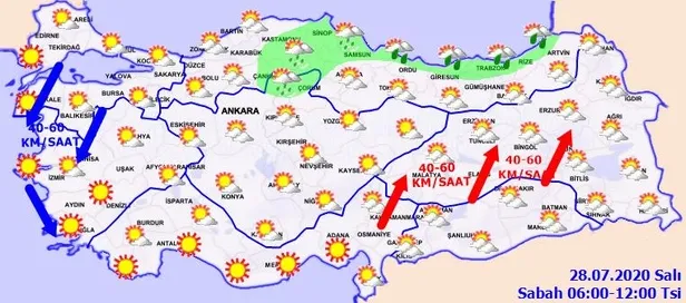 RÜZGAR: Genellikle kuzeyli, Akdeniz kıyıları ile Güneydoğu Anadolu'da güney ve batı yönlerden hafif, ara sıra orta kuvvette, Kıyı Ege, Doğu Anadolu'nun güney ve batısı, Güneydoğu Anadolu'nun kuzey kesimleri ve Doğu Karadeniz'in iç ve yüksek kesimleri ile Erzurum, Muş ve Bitlis çevrelerinde güneybatıdan kuvvetli (40-60 km/sa) ve yer yer kısa süreli olarak fırtına (60-70 km/sa) şeklinde esmesi bekleniyor.