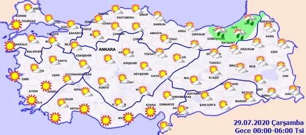 Meteoroloji Genel Müdürlüğü tarafından yapılan son değerlendirmelere göre: Ülkemizin kuzey ve doğu kesimlerinin parçalı ve yer yer çok bulutlu, Batı Karadeniz'in doğusu, Orta Karadeniz kıyıları, Doğu Karadeniz, Doğu Anadolu'nun doğusu, Çankırı, Çorum, Elazığ, Tunceli ve Bingöl çevreleri ile Malatya'nın kuzey ilçelerinin yerel olmak üzere sağanak ve gök gürültülü sağanak yağışlı, diğer yerlerin az bulutlu ve açık geçeceği tahmin ediliyor. Yağışların; Rize ve Artvin kıyı kesiminde yerel olarak kuvvetli olması bekleniyor.