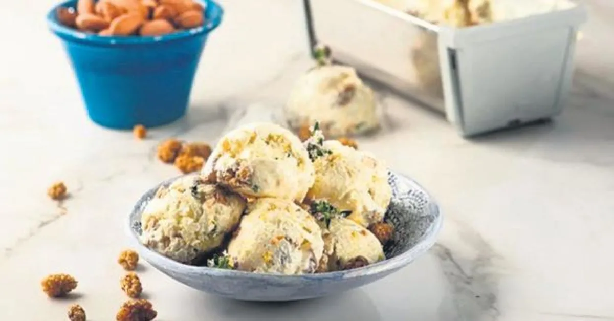 Portakalları rendenin küçük delikli yanıyla rendeleyin. Bademleri küçük parçalar şeklinde kesin. Süzme yoğurt, badem, portakal kabuğu, dutlar, bal ve kıyılmış naneyi büyük bir metal kabın içine alıp iyice karıştırın. İşte Kuru meyveli ve portakallı dondurma tarifinin devamı...
