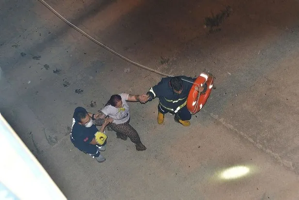 Köprü üzerindeki vatandaşlar, can simidine tutunan Cansu K.'yı halatla yukarı çekti.