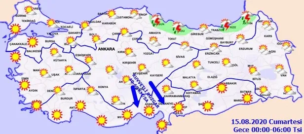 Meteoroloji Genel Müdürlüğü tarafından yapılan son değerlendirmelere göre: Ülkemizin kuzey kesimlerinin parçalı yer yer çok bulutlu, Orta ve Doğu Karadeniz kıyıları, Sinop, Tokat, Artvin ile Van'ın doğusu ve Ağrı'nın güneyinin yerel olmak üzere sağanak ve gök gürültülü sağanak yağışlı geçeceği tahmin ediliyor. Yağışların bugün sabah saatlerinde Samsun, Ordu ve Giresun, öğle saatlerinden sonra Trabzon'un doğusu, Rize ve Artvin kıyılarında yer yer kuvvetli (21-50 kg/metrekare) olması bekleniyor.