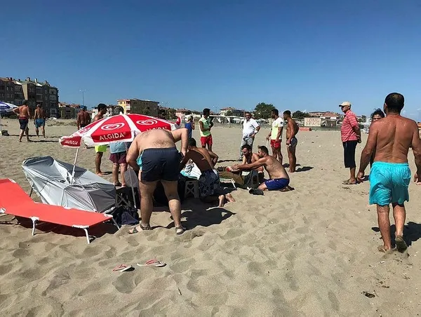 Karasu Plajı'nda eşi ve kızıyla birlikte denize girip, güneşlenen N.K.'nin yanına, evine yaptırdığı sundurma nedeniyle belediyeye şikayet ettiği H.Ö. geldi. İkili arasında çıkan tartışma, kavgaya dönüştü.