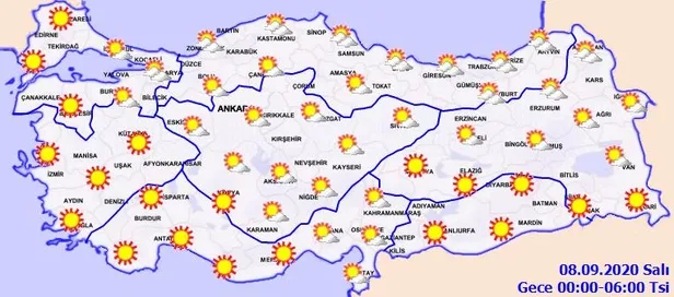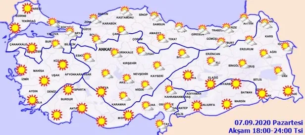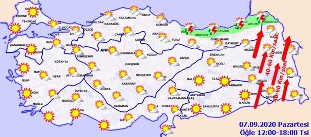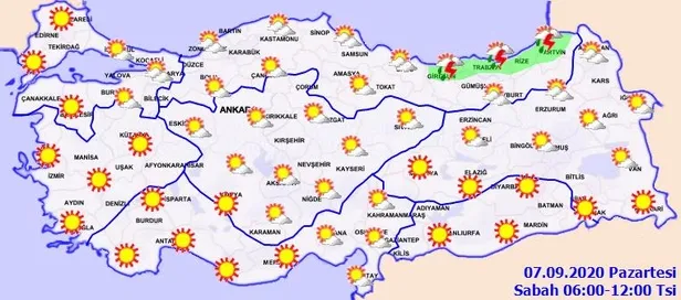 Meteoroloji Genel Müdürlüğü tarafından yapılan son değerlendirmelere göre; Ülkemizin kuzey kesimlerinin parçalı yer yer çok bulutlu; Doğu Karadeniz kıyıları ile Ordu, Artvin ve Ardahan çevrelerinin sağanak ve gök gürültülü sağanak yağışlı, diğer yerlerin az bulutlu ve açık geçeceği tahmin ediliyor. Rüzgarın; Doğu Anadolu'nun doğusunda kuvvetli (40-60 km/saat) olarak esmesi beklendiğinden meydana gelebilecek olumsuzluklara karşı dikkatli ve tedbirli olunmalıdır. Peki İstanbul, Ankara ve İzmir'de hava nasıl olacak? İşte, 7 Eylül il il hava durumu tahminleri...