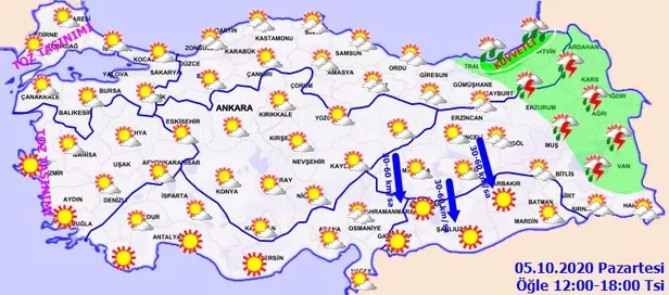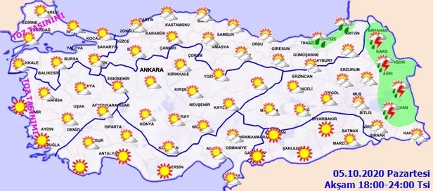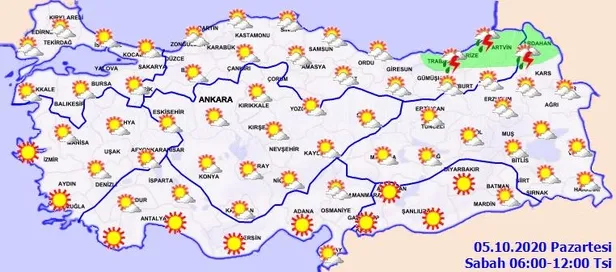 Meteoroloji Genel Müdürlüğü tarafından yapılan son değerlendirmelere göre ülkemizin kuzeydoğusunun parçalı, yer yer çok bulutlu, Trabzon, Rize, Artvin, Erzurum, Ardahan, Kars, Iğdır, Ağrı ve Van çevreleri ile Muş'un doğu kesimlerinin yerel sağanak ve gök gürültülü sağanak yağışlı, diğer yerlerin az bulutlu ve açık geçeceği tahmin ediliyor. Yağışların Rize il geneli ile Trabzon'un doğu, Artvin'in kıyı kesimlerinde yerel kuvvetli olması bekleniyor. Marmara'nın batısı ile Kıyı Ege'de Kuzey Afrika kaynaklı toz taşınımı görülmesi beklenmektedir. Peki İstanbul, Ankara ve İzmir'de hava nasıl olacak? İşte, 5 Ekim il il hava durumu tahminleri...