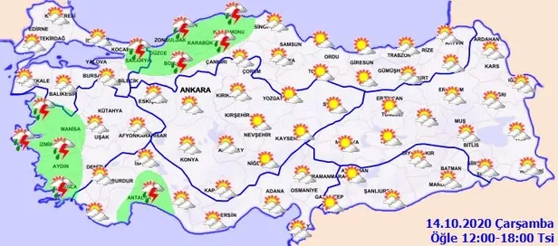 Meteoroloji Genel Müdürlüğünden son dakika hava durumu uyarıları gelmeye devam ediyor. Meteorolojiden yapılan son değerlendirmelere göre, ülkemizin kuzey, iç ve batı kesimlerinin parçalı ve yer yer çok bulutlu, Ege, Batı Karadeniz, Doğu Karadeniz kıyıları, İskenderun Körfezi ile Çanakkale, Sakarya, Bilecik, Antalya, Burdur, Eskişehir ve Ordu çevreleri ile Çankırı'nın kuzey ilçelerinin sağanak ve gök gürültülü sağanak yağışlı, diğer yerlerin az bulutlu ve açık geçeceği tahmin ediliyor. Peki, İstanbul, Ankara ve İzmir'de hava nasıl olacak? İşte, 14 Ekim il il hava durumu tahminleri...