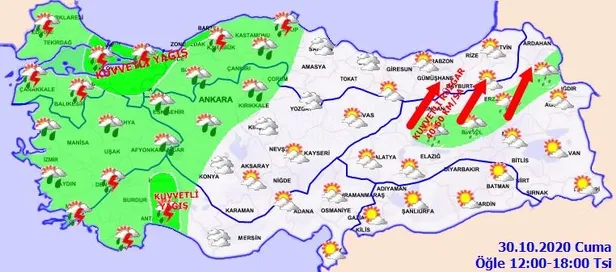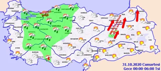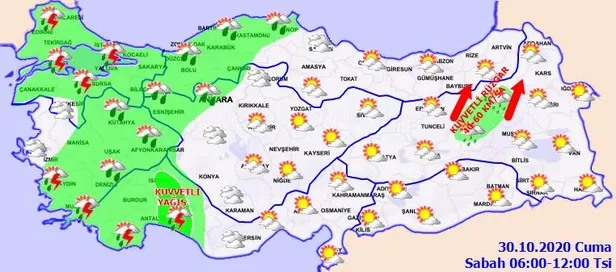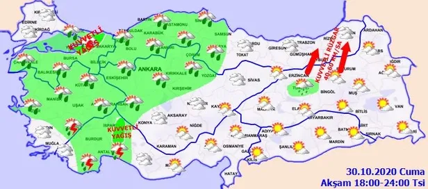 Meteoroloji Genel Müdürlüğü tarafından yapılan son değerlendirmelere göre; ülkemizin kuzey, iç ve batı kesimlerinin parçalı ve yer yer çok bulutlu, Marmara, Ege, Batı Akdeniz, İç Anadolu'nun kuzeybatısı ve Batı Karadeniz ile Kırşehir, Yozgat, Amasya, Samsun, Çorum, Tunceli, Bingöl, Erzurum ve Kars çevrelerinin aralıklı sağanak ve gök gürültülü sağanak yağışlı, diğer yerlerin az bulutlu ve açık geçeceği tahmin ediliyor. Yağışların; öğle saatlerinden itibaren İstanbul, Marmara'nın doğusu (Bursa, Yalova, Kocaeli, Sakarya, Bilecik), Antalya'nın Aksu, Serik, Manavgat ve İbradı İlçelerinde, zamanla Batı Karadeniz'in kıyı kesimlerinde (Düzce, Zonguldak, Bartın) kuvvetli (21-50 kg/m2); İstanbul'un Anadolu Yakasının kuzey kesimleri, Kocaeli'nin Kandıra, Sakarya'nın Kaynarca ve Ferizli ilçeleri ile Isparta çevrelerinde yer yer çok kuvvetli (50-75 kg/m2) olması bekleniyor.