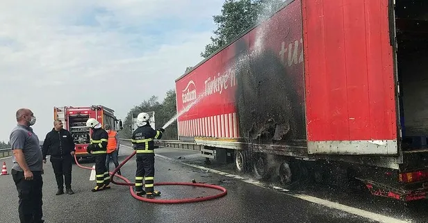 Son dakika: TEM de TIR alev alev yandı! Soğukkanlı sürücü yanan tırını sol şeride çekerek kazaları önledi