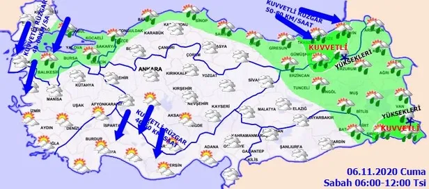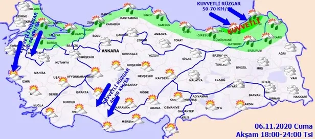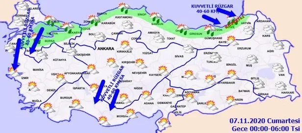 RÜZGAR: Genellikle kuzey ve kuzeydoğu yönlerden hafif, ara sıra orta kuvvette, Marmara'nın batısı, Kuzey Ege kıyıları, İç Anadolu'nun güneybatısı ve Batı Akdeniz'in iç kesimlerinde kuvvetli (30-60 km/sa), Orta ve Doğu Karadeniz kıyılarında batı ve kuzeybatı yönlerden kuvvetli ve kısa süreli fırtına (50-80 km/sa) şeklinde eseceği tahmin ediliyor.