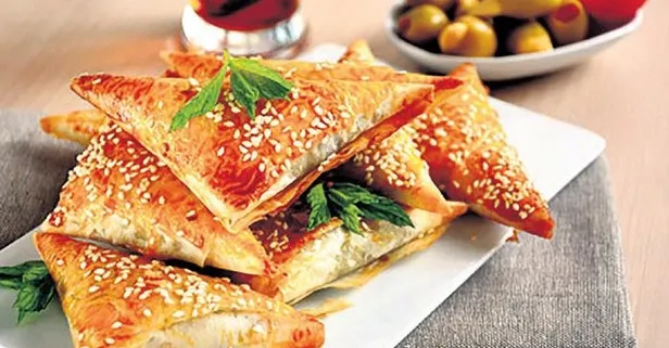 Kıyılmış maydanoz ve ufalanmış peyniri karıştırın. Yufkaları 5 cm genişliğinde uzun şeritler halinde kesin. Şeritlerin uç kısımlarına birer tatlı kaşığı maydanozlu karışımdan koyup muska şeklinde sarın. 25 cm çapında yuvarlak ve kelepçeli kalıbı 1 tatlı kaşığı tereyağı ile yağlayıp pişirme kağıdıyla kaplayın. Muska gibi sarılmış yufkaları, kalıba sivri tarafları yukarı gelecek şekilde yerleştirin. Sos için tereyağını eritip soğutun. Üzerine yumurta ve süt ekleyip mikserle çırpın ve yufkaların üzerine dökün. Kalıbın üzerini kapatıp bir gece buzdolabında dinlendirin. Ertesi gün üzerlerine susam serpip önceden ısıtılmış 175 derece fırında kızarana kadar yaklaşık 35-40 dakika pişirin. Sıcak servis yapın.