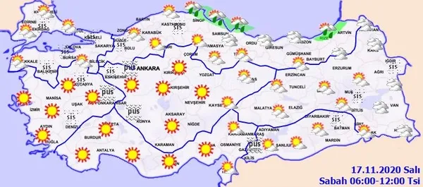 Sabah ve gece saatlerinde Marmara, İç Ege ve İç Anadolu'nun batısı ile Batı Karadeniz'in iç kesimlerinde yer yer pus ve sis bekleniyor. Hava sıcaklıklarında önemli bir değişiklik olmaması ve mevsim normalleri civarında seyretmesi öngörülüyor.