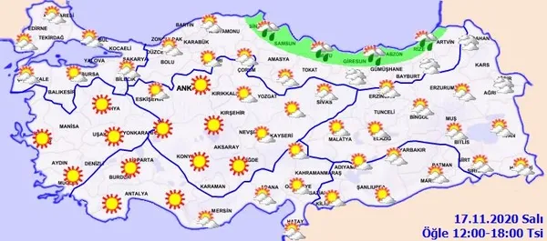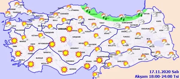 Meteoroloji Genel Müdürlüğünden son dakika hava durumu uyarıları gelmeye devam ediyor. Yapılan son değerlendirmeye göre, yurdun kuzeydoğu kesimlerinin parçalı ve yer yer çok bulutlu, Orta ve Doğu Karadeniz kıyıları ile Sinop çevrelerinin aralıklı sağanak yağışlı, diğer yerlerin az bulutlu ve açık geçeceği tahmin ediliyor. Sabah ve gece saatlerinde Marmara, İç Ege ve İç Anadolu'nun batısı ile Batı Karadeniz'in iç kesimlerinde pus ve yer yer sis hadisesi bekleniyor. Peki, İstanbul, Ankara ve İzmir'de hava nasıl olacak? İşte, 17 Kasım il il hava durumu tahminleri...