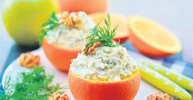 Kereviz, elma ve portakalı soyun. Kereviz ve elmayı iri rendeleyin. Portakalı ise incecik doğrayın. Cevizlerin yarısını elinizle ufalayın. Bir kapta süzme yoğurt, mayonez ve ezilmiş sarımsağı karıştırın. Sosu kereviz, elma ve portakala ekleyip karıştırın. Servis tabağına alın. Kalan ceviz ve taze kekikle süsleyerek servis yapın. Elmalı ve portakallı kereviz salatası tarifinin detayları.