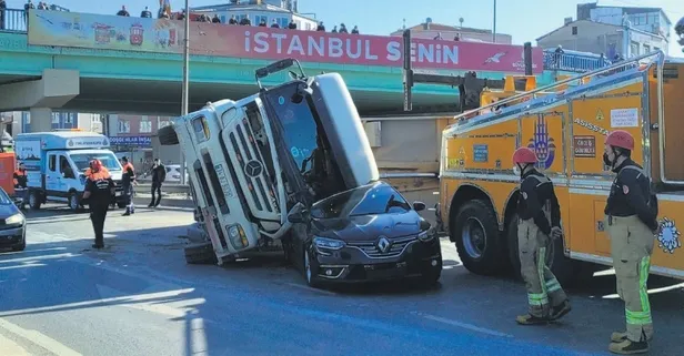 İstanbul Şişli'de hafriyat kamyonu sürücüsü Fatih Yeşilyurt (25), virajı alamayarak önünde bulunan Sefa Şahin'in kullandığı otomobile arkadan çarptı. Kamyonun taş yüklü kasası yan yatarken, ön tarafı da aracın üzerine devrildi. Kazada mucize eseri kimsenin burnu dahi kanamadı.