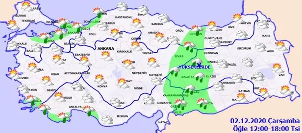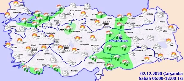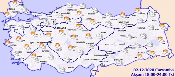 Meteoroloji Genel Müdürlüğü tarafından yapılan son değerlendirmelere göre, ülkemiz genelinin parçalı ve yer yer çok bulutlu, Marmara'nın doğusu, Doğu Anadolu'nun batısı, Güneydoğu Anadolu'nun batısı ile Muğla, Antalya, Kahramanmaraş, Düzce, Zonguldak, Bartın, Giresun, Sivas, Ankara çevreleri, Samsun'un doğu ilçeleri ve Trabzon'un batısının yağışlı geçeceği tahmin ediliyor. Yağışların; genellikle yağmur ve sağanak, Tunceli ve Erzincan'ın yüksek kesimlerinde karla karışık yağmur ve kar yağışı şeklinde olması bekleniyor. Sabah ve gece saatlerinde iç ve doğu bölgelerde buzlanma ve don olayı ile birlikte yer yer pus ve sis hadisesi bekleniyor.