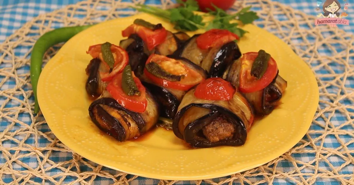 Köfte için tüm malzemeyi geniş bir kaba alın ve 5-6 dakika yoğurun. Harçtan ceviz büyüklüğünde parçalar koparıp avucunuzda önce yuvarlayın ardından yassılaştırın. Az yağlı tavada kızartın. Patlıcanları alacalı soyun ve boyuna uzun şeritler halinde dilimleyin. Tuzlu suda acı suyu çıkana kadar 20 dakika bekletin. Suyunu süzüp kağıt havluyla kurulayın. Ardından az yağlı tavada, önlü arkalı kızartın. Pişen patlıcanların içine köfteleri yerleştirip rulo şeklinde sarın. Fırın tepsisine yerleştirin. Sos malzemesinin tamamını karıştırın ve köftelerin üzerine gezdirin. Önceden ısıtılmış 180 derece fırında 25-30 dakika pişirip servis yapın.