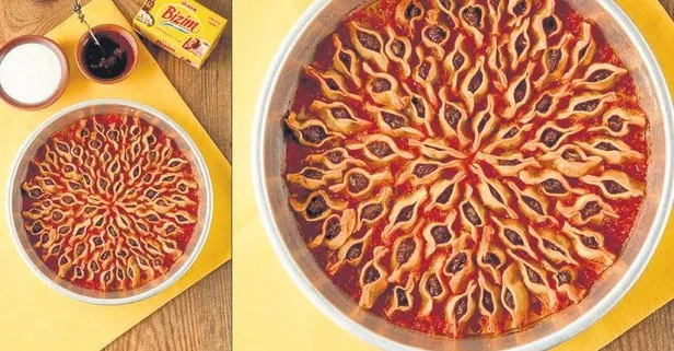 Hamur için unu yoğurma kabına alıp ortasını havuz şeklinde açın. Yumurta ve tuz ekleyip karıştırın. Yavaşça su ilave edip hafif sert bir hamur elde edin. Üzerini nemli bizle örtüp 10-15 dakika dinlendirin. Hamuru bezelere ayırıp merdane yardımıyla çok ince olmayacak şekilde açın. 4x4 cm büyüklüğünde kareler halinde kesin