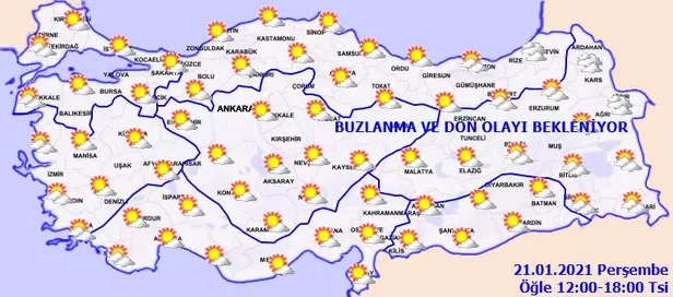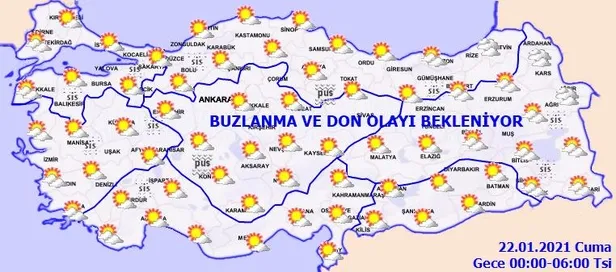 Meteoroloji Genel Müdürlüğü tarafından yapılan son değerlendirmelere göre, ülkemizin doğu kesimleri ile zamanla Kıyı Ege'nin parçalı ve yer yer çok bulutlu, sabah saatlerinde Rize ve Artvin çevrelerinin karla karışık yağmur ve kar yağışlı, diğer yerlerin az bulutlu geçeceği tahmin ediliyor. Sabah ve gece saatlerinde kıyılarda hafif, iç ve doğu kesimlerde kuvvetli buzlanma ve don olayı ile birlikte yer yer pus ve sis hadisesi bekleniyor.