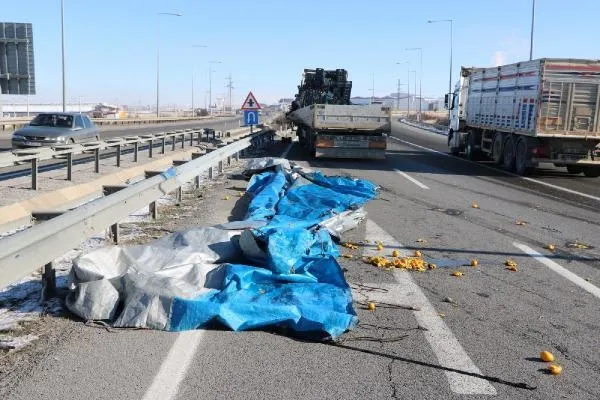 Niğde-Kayseri karayolunda hareket halindeki Levent Polat yönetimindeki 50 AZ 950 plakalı limon yüklü TIR'ın dorsesinin yan kapağı açıldı.