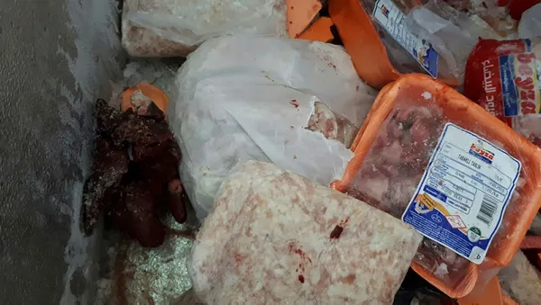 Market içerisindeki dondurma dolabını açan ekipler, tarihi geçmiş ve bozulmuş kilolarca tavuk, et ve kıymayla karşılaştı.