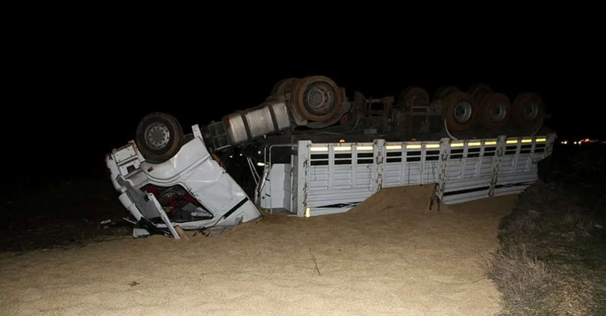 Manisa'da arpa yüklü tır ters döndü! Yaralılar var