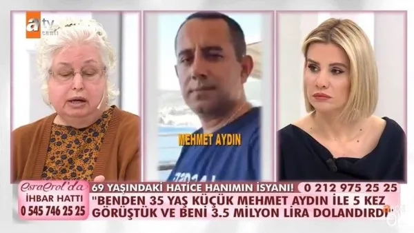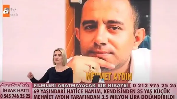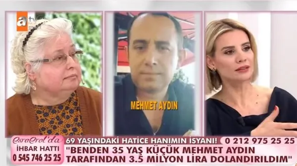 ATV ekranlarında yayınlanan Esra Erol'da programı, dün ilginç bir dolandırıcılık olayını işlemeye başladı. 69 yaşında emekli mali müşavir olan dolandırıcılık üzerine raporlar yazan Hatice Hanım'ın başına gelenler herkesi şoke etti. Sosyal medya üzerinden kendisinden 35 yaş küçük olan Mehmet Aydın ile tanışan Hatice Hanım'a, evlilik vaadiyle tam 7 kez buluştu. Kendisini 52 yaşında olarak tanıtan adam, Hatice Hanım'a ünlü bir ailenin üyesi olduğunu, pırlanta ve altın işleriyle uğraşan bir holdingde çalıştığını söyledi.
