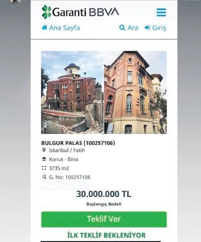 İstanbul'un simge yapılarından biri olan Cerrahpaşa semtindeki 'Bulgur Palas', sürpriz bir şekilde satışa çıktı. Garanti BBVA'nın satışa çıkardığı tarihi bina için istenen bedel 30 milyon TL olarak belirlendi.