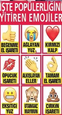 Gözlerinden kalp çıkan gülen surat, kadınların en sevdiği emojiydi. Dünyada bir günde 6 milyar emoji kullanıldığı belirtilirken Perspectus Global'den Evie Porter, "Bu sembollerin artık hem kişisel hem de profesyonel düzeyde günlük iletişimimizin hayati bir parçası olduğu açık" dedi.