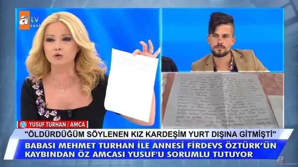 Canlı yayında babası Mehmet Turhan'ın geçmişte kız kardeşi Havva'yı 15 yıllık arkadaşını ve gasp ettiği başka bir şahsın cinayetinden sorumlu olduğunu söyledi.