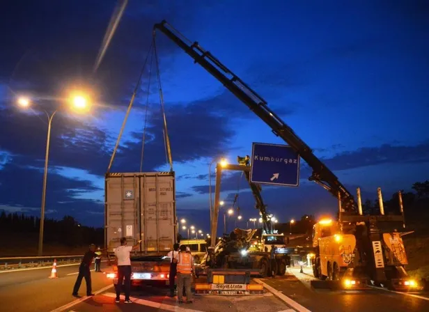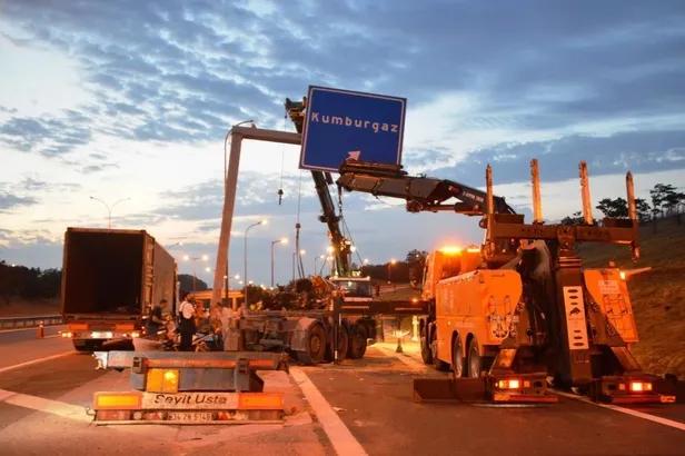 06 JSB 81 plakalı TIR'ı kullanan Bülent Çaylak (45), Kumburgaz yol ayrımına geldiği sırada henüz bilinmeyen bir nedenle kontrolü kaybederek tabela direğine çarptı.