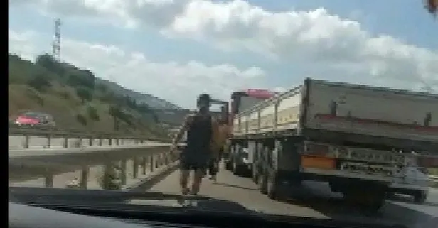 TIR sürücüsünü korna çalarak uyaran Cemal Özbudak, TIR sürücüsünün bu hareketlerine devam etmesi nedeniyle cep telefonunu alarak görüntülemeye başladı.