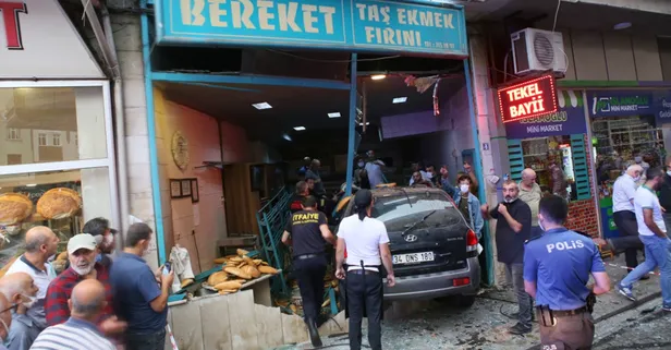 Sürücüsünün direksiyon hakimiyetini kaybettiği otomobil ekmek fırınına girerek durabildi. Bu sırada bir yaya ise otomobilin altında kalmaktan son anda geri çekilerek kurtuldu. Fırın sahibi Zeki Kuyumcu ile çalışan Ahmet Kaçalın tezgahla duvar arasında sıkıştı.