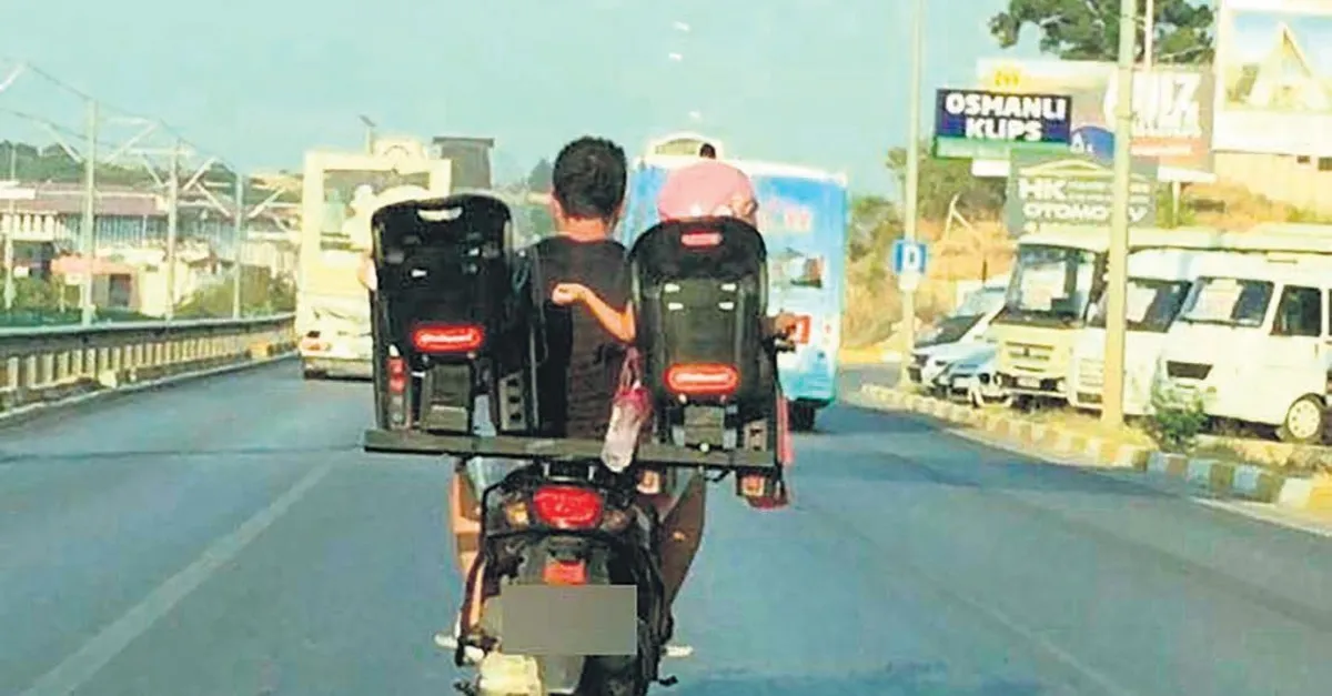 Antalya'da bir baba, iki çocuğunun seyahati için motosiklete iki farklı puset yerleştirdi. Çocuklarıyla birlikte trafiğe çıkması büyük tepki çekti.