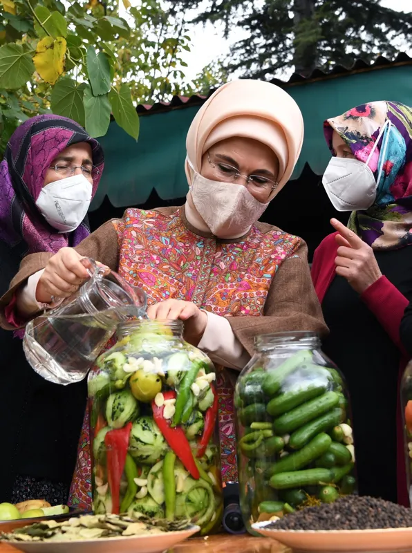Başkan Recep Tayyip Erdoğan'ın eşi Emine Erdoğan, Ankara'nın Çubuk ilçesine bağlı Aşağı Çavundur Mahallesi'ndeki kadınlar ile bir araya gelerek turşu kurdu.