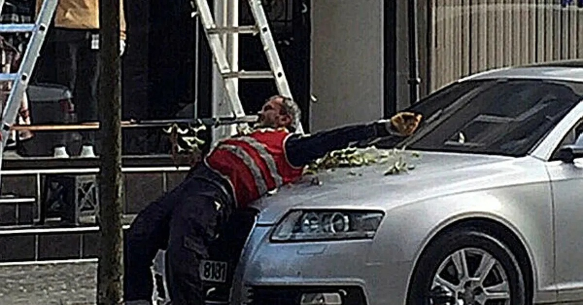 Sürücüyü bulamayan Dikmen, araç zarar görmesin diye üzerine sırt üstü yattı. O an ise fotoğraflanarak sosyal medyada, 'Vatandaşın arabasına zarar gelmesin diye göğsünü siper eden fedakar belediye işçisi Veysel Dikmen' diye paylaşıldı.