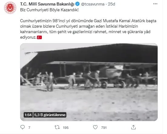 Milli Savunma Bakanlığı, Cumhuriyet Bayramı'na özel hazırladığı klibi sosyal medya hesabından paylaştı. Milli Mücadele döneminden görüntülerin yer aldığı klip, "Biz Cumhuriyeti böyle kazandık! Cumhuriyetimizin 98'inci yıl dönümünde Gazi Mustafa Kemal Atatürk başta olmak üzere bizlere Cumhuriyeti armağan eden İstiklal Harbimizin kahramanlarını, tüm şehit ve gazilerimizi rahmet, minnet ve şükranla yad ediyoruz" notuyla paylaşıldı.