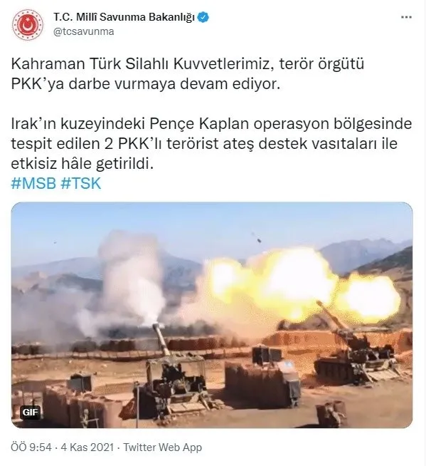 Milli Savunma Bakanlığından yapılan açıklamada 'Kahraman Türk Silahlı Kuvvetlerimiz, terör örgütü PKK’ya darbe vurmaya devam ediyor. Irak’ın kuzeyindeki Pençe Kaplan operasyon bölgesinde tespit edilen 2 PKK’lı terörist ateş destek vasıtaları ile etkisiz hâle getirildi.' denildi.