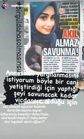 Nişanlısını kaybeden Mahir Mızrak, caninin annesine böyle seslendi: Annesinin yargılanmasını istiyorum. Böyle bir cani yetiştirdiği için, yaptığı şeyi savunacak kadar vicdansız olduğu için.