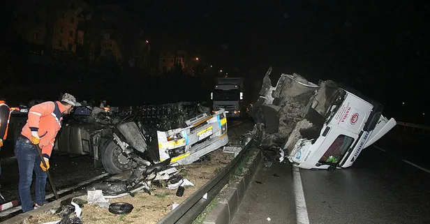 Manisa'nın Kula ilçesinde yağışlı havanın da etkisiyle kayganlaşan yolda kontrolden çıkan tır, aynı yönde seyreden başka bir tıra arkadan çarpıp orta refüje çıktı. Tırın kupa bölümü orta refüjü aşarak karşı şeride geçerken, ikiye bölünen tırın kupası kazanın şiddetini gözler önüne serdi.