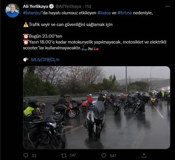 İstanbul Valiliğinden yapılan açıklamada, İstanbul'da hayatı olumsuz yönde etkileyen lodos fırtınası nedeniyle motosiklet kazalarının önlenmesi, trafik seyir ve can güvenliğinin korunması açısından karar alındığı bildirildi.