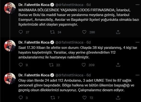 Sağlık Bakanı Fahrettin Koca, Marmara Bölgesi'nde hayatı olumsuz etkileyen lodosla ilgili açıklamalarda bulundu. 4 kişinin hayatını kaybettiğini belirten Bakan Koca, "Marmara Bölgesindeyaşanan lodos fırtınasında; İstanbul, Bursa ve Bolu'da maddi hasar ve yaralanma meydana gelmiş, İstanbul Esenyurt, Arnavutköy, Avcılar ve Başakşehir ilçeleri yoğunlukta olmakla bazı ilçelerimizde afet olayları yaşanmıştır. Saat 17.30 itibarı ile afette son durum: Olayda 38 kişi yaralanmış, 4 kişi ise hayatını kaybetmiştir. Yaralılar, olay yerine görevlendirilen 112 ambulanslarımız ile hastaneye nakledilmiştir. Olay olan illerde 24 adet 112 Ambulansı, 3 adet UMKE Timi ile 87 sağlık personeli görev başındadır. Bölge halkına ve bütün ülkemize başsağlığı ve geçmiş olsun dileklerimizi sunuyoruz. Çalışmalarımız devam ediyor." ifadelerini kullandı.