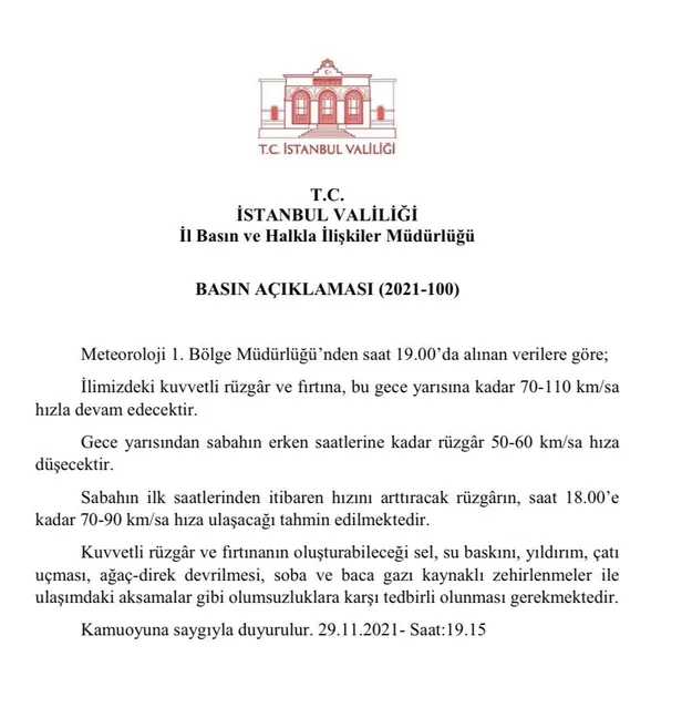 "Sabahın ilk saatlerinden itibaren hızını arttıracak rüzgarın, saat 18.00'e kadar 70-90 km/sa hıza ulaşacağı tahmin edilmektedir. Kuvvetli rüzgar ve fırtınanın oluşturabileceği sel, su baskını, yıldırım, çatı uçması, ağaç-direk devrilmesi, soba ve baca gazı kaynaklı zehirlenmeler ile ulaşımdaki aksamalar gibi olumsuzluklara karşı tedbirli olunması gerekmektedir."
