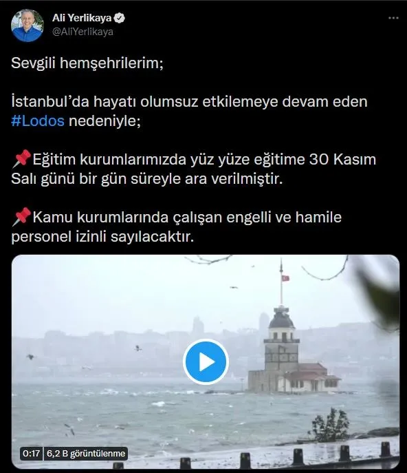 İstanbul Valisi Ali Yerlikaya, yüz yüze eğitime bir gün ara verildiğini açıkladı. Yerlikaya, yaptığı açıklamada, "Sevgili hemşehrilerim; İstanbul'da hayatı olumsuz etkilemeye devam eden #Lodos nedeniyle; Eğitim kurumlarımızda yüz yüze eğitime 30 Kasım Salı günü bir gün süreyle ara verilmiştir. Kamu kurumlarında çalışan engelli ve hamile personel izinli sayılacaktır." ifadelerini kullandı.