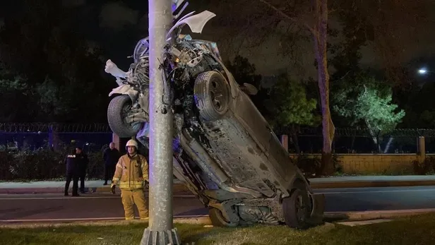 İstanbul Yeşilköy Havuzlu Kavşak’ta aşırı hız yapan otomobil virajı alamayınca önce refüje çarptı ardından yön tabelası direğine uçtu. Direkte asılı kalan araçta bir kişi yaralandı.