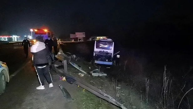 Yol kenarındaki çelik bariyerleri yırtarak 50 metre sürüklenen otobüs, yol kenarındaki yamaçtan tarlaya uçtu.