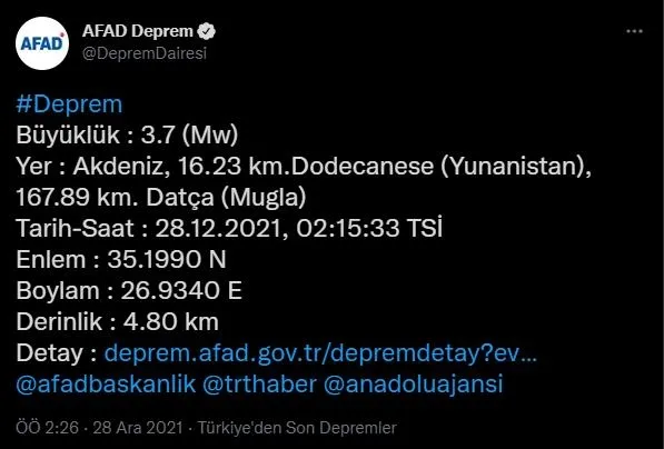 AFAD'ın yaptığı paylaşımda depremin 3.7 şiddetinde olduğu aktarıldı.
