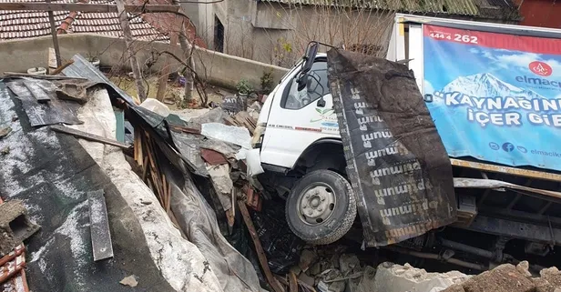 Eyüpsultan'da kontrolden çıkan kamyonet gecekondunun çatısına uçtu