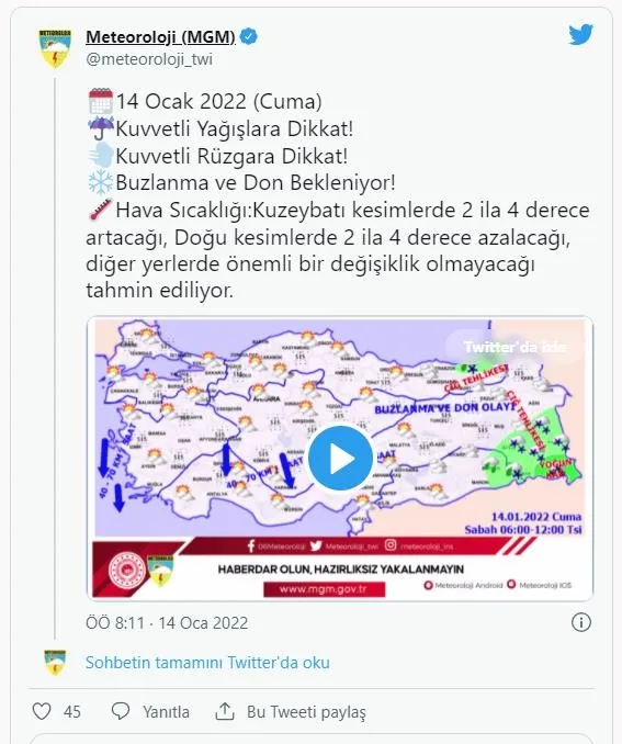 Meteoroloji'den yapılan son dakika açıklamada vatandaşlar kuvvetli yağış, kuvvetli rüzgar ve buzlanma-don olaylarına karşı uyarıldı.